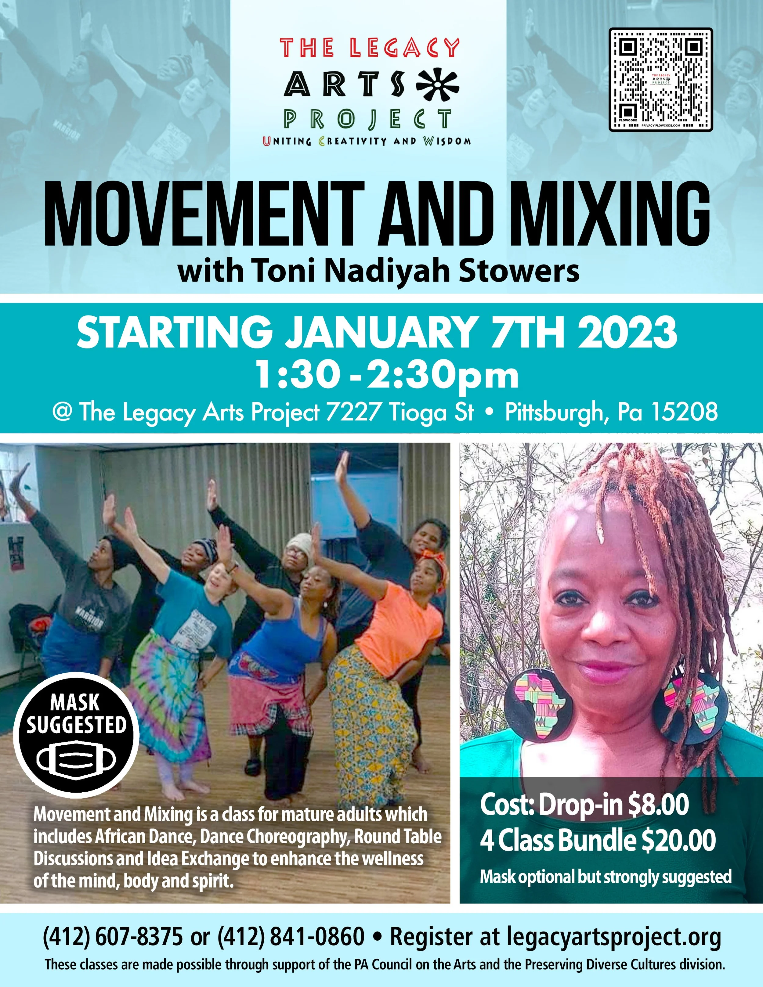 Movement and Mixing is a class for mature adults which includes African Dance, Dance Choreograpy, Round Table Discussions and Idea Exchange to enhance the wellness of the mind, body and spirit.