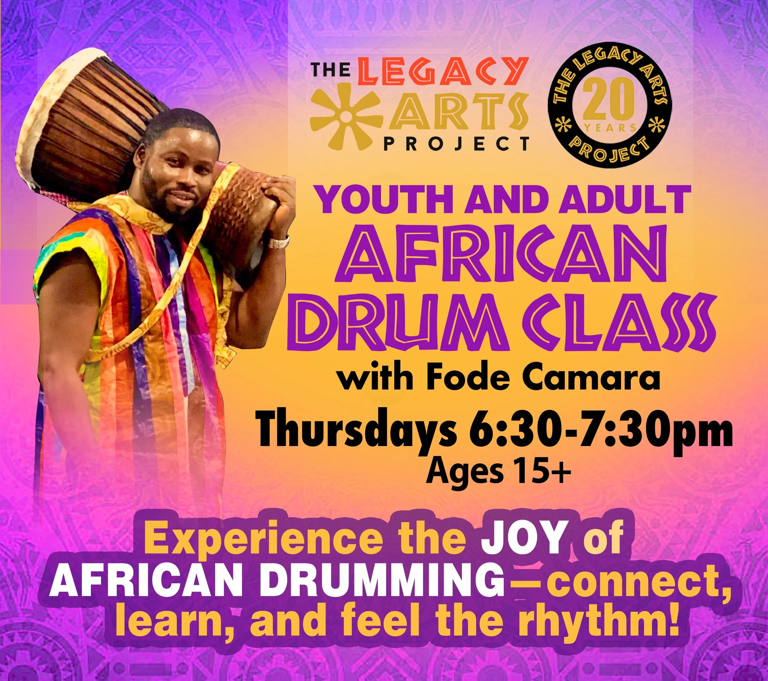 Please join The Legacy Arts in this amazing African Drum class lead by world renowned musician Fode “Lavia” Camara. Let Fode take you on a journey through Africa with the sounds of the drum. This class is for ages 15+.